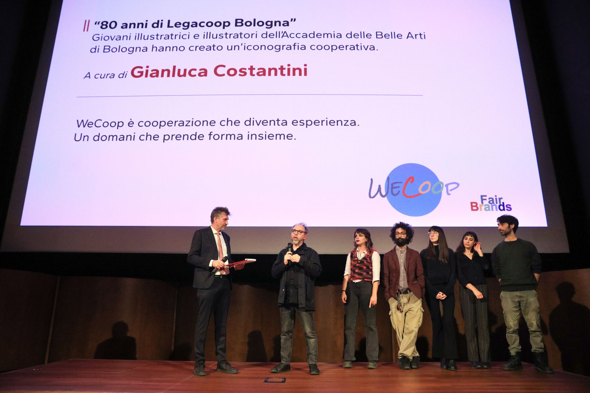 Il momento è poi proseguito con la presentazione del progetto WeCoop, ideato dal collettivo FairBrands: giovani artiste e artisti dell’Accademia delle Belle Arti di Bologna hanno illustrato tutte le tappe dell’anniversario guidati da Gianluca Costantini che a sua volta ha presentato “80 di Legacoop Bologna”, un’opera che con un tratto inconfondibile e l’uso di soli tre colori parla di collaborazione, forza e futuro. Non solo, a chiudere il cerchio il video racconto per immagini della regista Giulia Giapponesi, “80 in un battito”: un’ideazione incalzante per un prodotto inedito che alternando immagini storiche della cooperazione a quelle più attuali, disegna un’identità che si co-costruisce nel tempo.