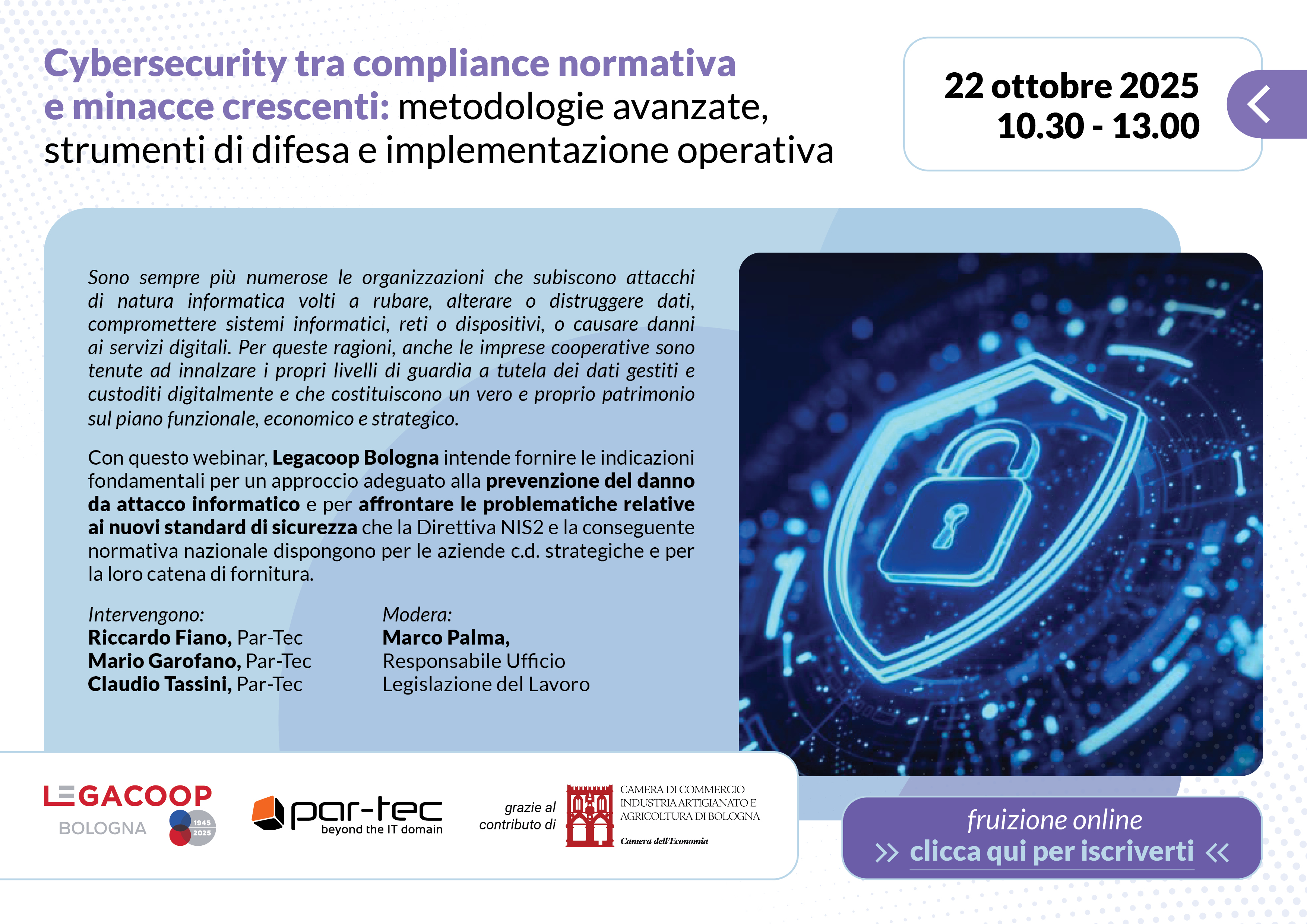 Il webinar è organizzato con il contributo di Par-Tec e rientra nel programma di iniziative promosse da Legacoop Bologna per accompagnare le imprese cooperative nel percorso di trasformazione digitale e di rafforzamento della sicurezza informatica.