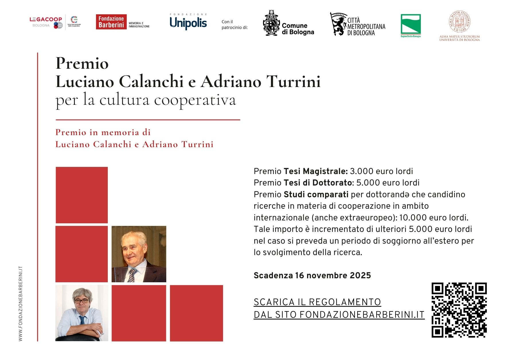 Il premio Luciano Calanchi e Adriano Turrini per la cultura cooperativa è organizzato da Legacoop Bologna, Fondazione Barberini e Fondazione Unipolis con il patrocinio della Città Metropolitana di Bologna, il Comune di Bologna, la Regione Emilia-Romagna e l’Università di Bologna, ed è dedicato alla memoria di due cooperatori che, nel corso della loro carriera, si sono impegnati per la promozione della cooperazione e caratterizzati per il dialogo e l’apertura ai giovani.